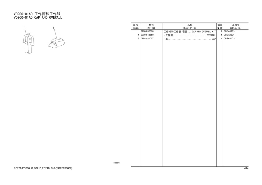 名称:09980-92550 工作帽和工作服 套件